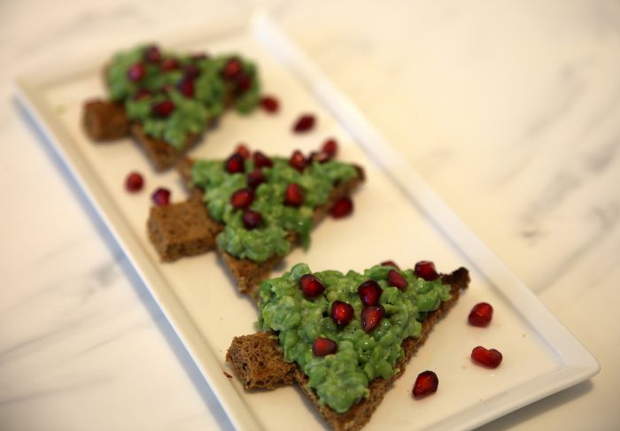 Rooster een bruine of witte boterham. Snijd er een eenvoudige dennenboom uit. Besmeer de dennenboom met een ruime hoeveelheid erwtenspread en versier het met de granaatappelpitjes.