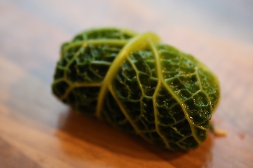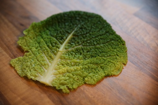 Breng een grote pan water aan de kook, voeg een theel. zeezout toe. Maak voorzichtig groene koolbladeren los, snijd de harde nerf plat af. Was de koolbladeren en blancheer deze ongeveer 5 minuten in het kokende water.