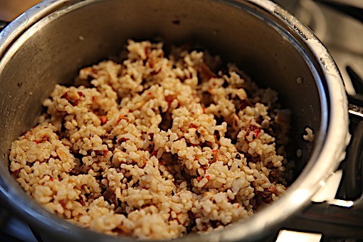 Rooster het notenmengsel in een droge koekenpan goudgeel. Hak dan de noten fijn, snijd de abrikozen in kleine stukjes en meng het met de gekookte rijst en breng het met zout, peper en chili op smaak.