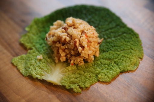 Neem een geblancheerd koolblad en leg erop een 1 a 2 eetl. van de rijstvulling. Rol de rijstvulling in het koolblaadje in en maak er een pakje van. Leg de pakjes met de open kant in de koekenpan of op een bakblik om ze warm te houden.