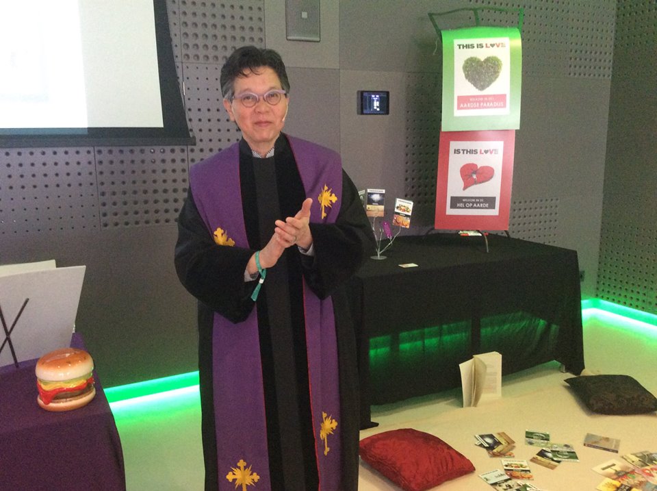 Net als vorig jaar mocht Vegan Church ook dit jaar een pop-updienst verzorgen op het VegFest. Om 11.30 uur openden we de dag met een laagdrempelige dienst rond het thema ‘Vegan from the heart’. Sandra Hermanus-Schröder sprak over Johannes 3 : 16: ‘want God heeft de wereld zo lief, dat hij zijn enige Zoon heeft gegeven, opdat iedereen die in hem gelooft niet verloren gaat, maar eeuwig leven heeft’. God is Liefde. God heeft de mens het rentmeesterschap over oftewel de verantwoording voor de aarde gegeven om naar het voorbeeld van God, dus vanuit diezelfde Liefde, voor Gods schepping te zorgen. En dat is heel iets anders dan dat we de schepping mogen misbruiken voor ons eigen gewin.